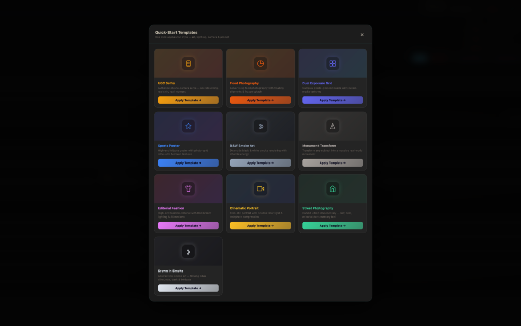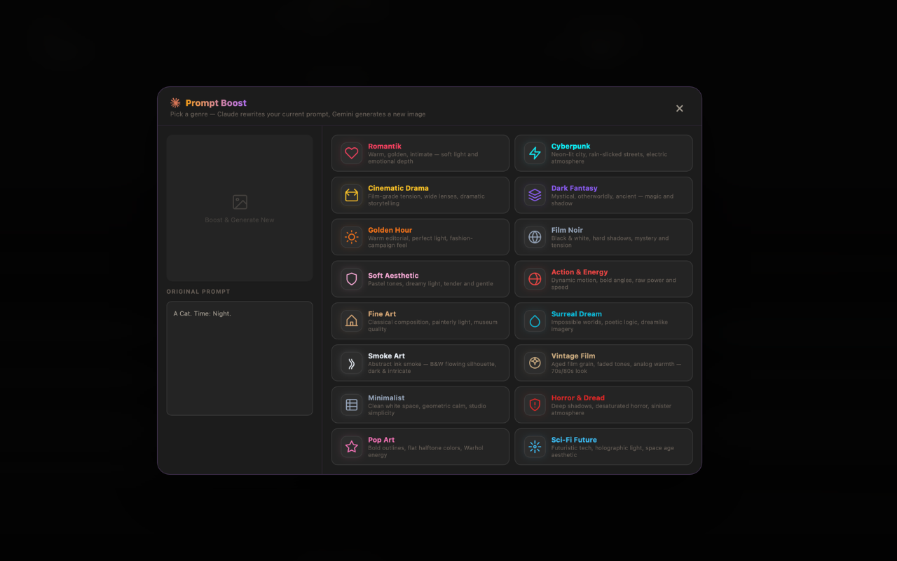 Prompt Templates + AI Boost β Ready-made prompt presets for every scenario β jump straight to stunning results. Plus: built-in Claude AI rewrites and supercharges your prompt automatically for maximum visual impact.